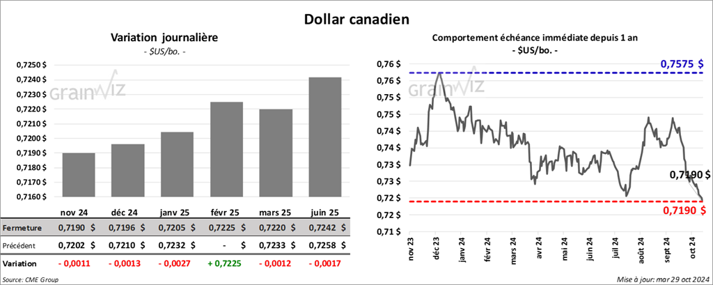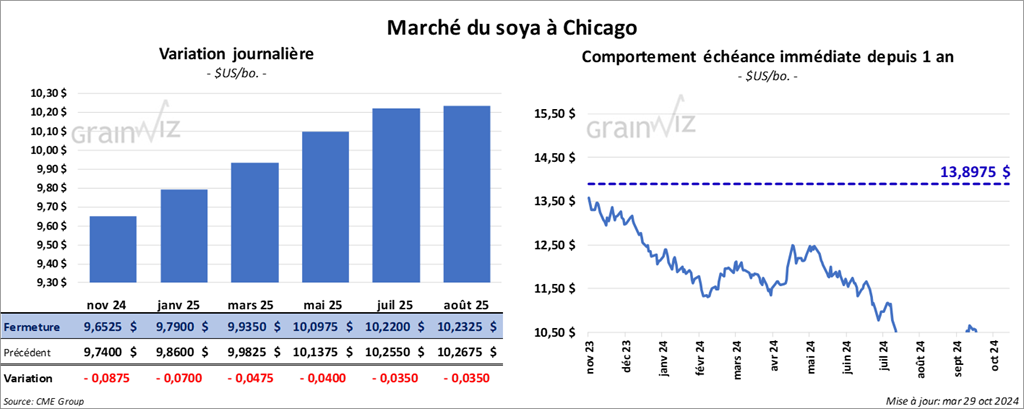 Le contrat de soya US nov. 24 a clôturé à 9,6525 $ (- 8 ¾ cents). Celui janv. 25 a fermé à 9,7900 $ (- 7 cents). Celui mars 25 a terminé à 9,9350 $ (- 4 ¾ cents). Quant au tourteau de soya US, le contrat déc. 24 a fini à 301,80 $/tonne (- 3,00 $/tonne). Celui janv. 25 a clôturé à 303,00 $/tonne (- 2,00 $/tonne). Celui mars 25 a fermé à 305,70 $/tonne (- 1,30 $/tonne). Du côté de l’huile de soya US, le contrat déc. 24 a terminé à 42,80 $ (+ 11 points). Celui janv. 25 a fini à 42,85 $ (+ 13 points).