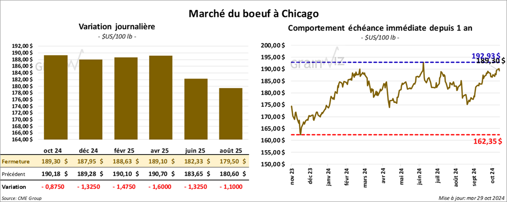 Le contrat de bœuf US oct. 24 a clôturé à 189,30 $ (- 88 cents). Celui déc. 24 a fermé à 187,95 $ (- 1,33 $). Celui févr. 25 a terminé à 188,63 $ (- 1,48 $). Quant au veau US, le contrat oct. 24 a fini à 250,03 $ (- 5 cents). Celui nov. 24 a clôturé à 246,60 $ (- 2,60 $). Celui janv. 25 a fermé à 244,03 $ (- 2,92 $).