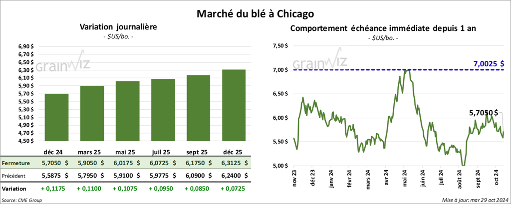 À Chicago, le contrat déc. 24 a clôturé à 5,7050 $ (+ 11 ¾ cents). Celui mars 25 a fermé à 5,9050 $ (+ 11 cents). Celui mai 25 a terminé à 6,0175 $ (+ 10 ¾ cents). À Kansas, le contrat de blé dur rouge d’hiver déc. 24 a fini à 5,6150 $ (- 10 ½ cents). Celui mars 25 a clôturé à 5,7550 $ (- 10 ¾ cents). Celui mai 25 a fermé à 5,8525 $ (- 10 ¾ cents). À Minneapolis, le contrat de blé de printemps déc. 24 a terminé à 6,0650 $ (+ 11 ¼ cents). Celui mars 25 a fini à 6,3000 $ (+ 12 cents). Celui mai 25 a clôturé à 6,4225 $ (+ 11 ¾ cents).