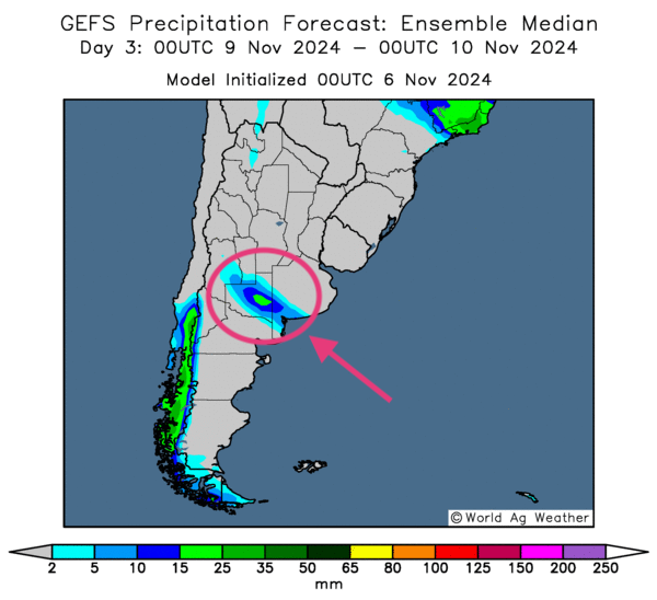 - Essentiellement, les conditions météo en Argentine sont à surveiller à court terme. L’analyse des cartes de l’Argentine, fournies par World Ag Weather et dessinées jusqu’au 3e jour, n’indique pas de possibilités de précipitations significatives pour la majorité des régions, sauf peut-être pour la province de La Pampa, comme le montre cette carte fournie par World Ag Weather et dessinée pour le 3e jour.