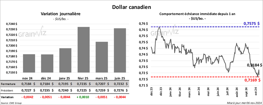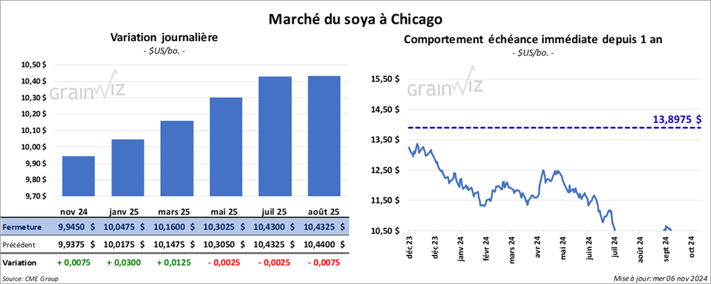 Le contrat de soya US nov. 24 a clôturé à 9,9450 $ (+ ¾ cent). Celui janv. 25 a fermé à 10,0475 $ (+ 3 cents). Celui mars 25 a terminé à 10,1600 $ (+ 1 ¼ cent). Quant au tourteau de soya US, le contrats déc. 24 a fini à 298,70 $/tonne (- 80 cents/tonne). Celui janv. 25 a clôturé à 299,40 $/tonne (- 1,20 $/tonne). Celui mars 25 a fermé à 302,10 $ /tonne (- 1,20 $/tonne). Du côté de l’huile de soya US, le contrat déc, 24 a terminé à 46,34 $ (+ 135 points). Celui janv. 25 a fini à 46,29 $ (+ 129 points).