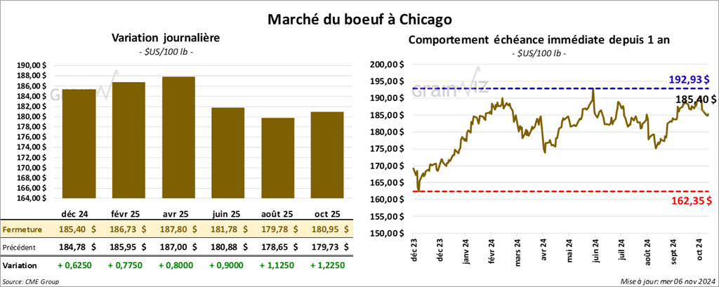 Le contrat de bœuf US déc. 24 a clôturé à 185,40 $ (+ 63 cents). Celui févr. 25 a fermé à 186,73 $ (+ 78 cents). Celui avr. 25 a terminé à 187,80 $ (+ 80 cents). Quant au veau US, le contrat nov. 24 a fini à 247,70 $ (+ 1,55 $). Celui janv. 25 a clôturé à 244,03 $ (+ 1,68 $). Celui mars 25 a fermé à 241,75 $ (+ 1,25 $).