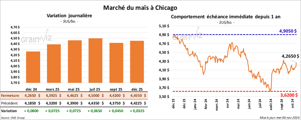 Le contrat de maïs US déc. 24 a clôturé à 4,2650 $ (+ 8 cents). Celui mars 25 a fermé à 4,3925 $ (+ 7 ¼ cents). Celui mai 25 a terminé à 4,4625 $ (+ 7 ¼ cents).