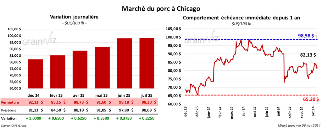 Le contrat de porc US déc. 24 a clôturé à 82,13 $ (+ 1,00 $). Celui févr. 25 a fermé 85,15 $ (+ 65 cents). Celui avr. 25 a terminé à 88,73 $ (+ 63 cents).