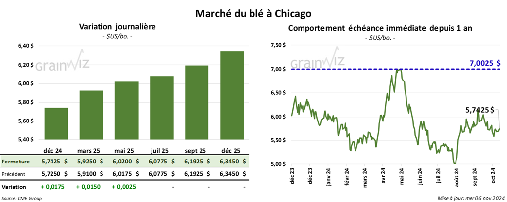 À Chicago, le contrat déc. 24 a clôturé à 5,7425 $ (+ 1 ¾ cent). Celui mars 25 a fermé à 5,9250 $ (+ 1 ½ cent). Celui mai 25 a terminé à 6,0200 $ (+ ¼ cent). À Kansas, le contrat de blé dur rouge d’hiver déc. 24 a fini à 5,7675 $ (+ 5 ¾ cents). Celui mars 25 a clôturé à 5,8900 $ (+ 5 ¼ cents). Celui mai 25 a fermé à 5,9850 $ (+ 5 ¼ cents). À Minneapolis, le contrat déc. 24 a terminé à 6,0550 $ (- 5 cents). Celui mars 25 a fini à 6,2750 $ (- 4 ¾ cents). Celui mai 25 a clôturé à 6,3775 $ (- 4 ½ cents).