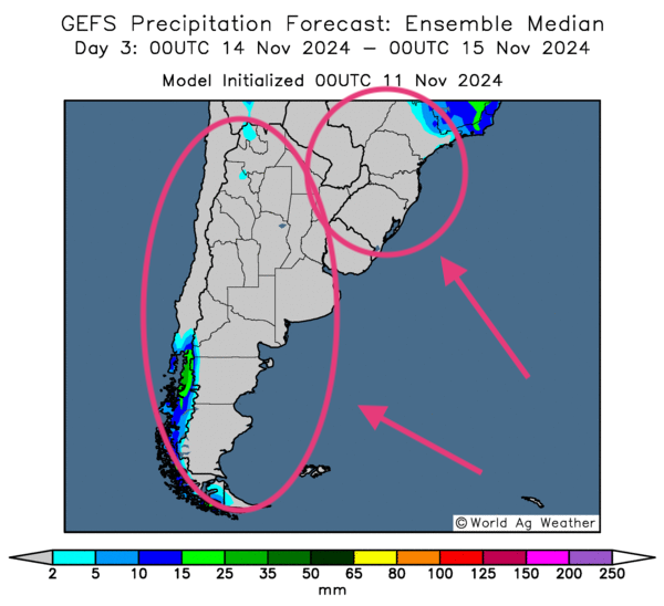 - Cette carte de l’Argentine, fournie par World Ag Weather et dessinée pour le 3e jour, montre une probabilité d’ensoleillement à la grandeur du pays (voir les zones grises). Elle indique aussi un temps sec possible pour le sud du Brésil (voir les zones grises).