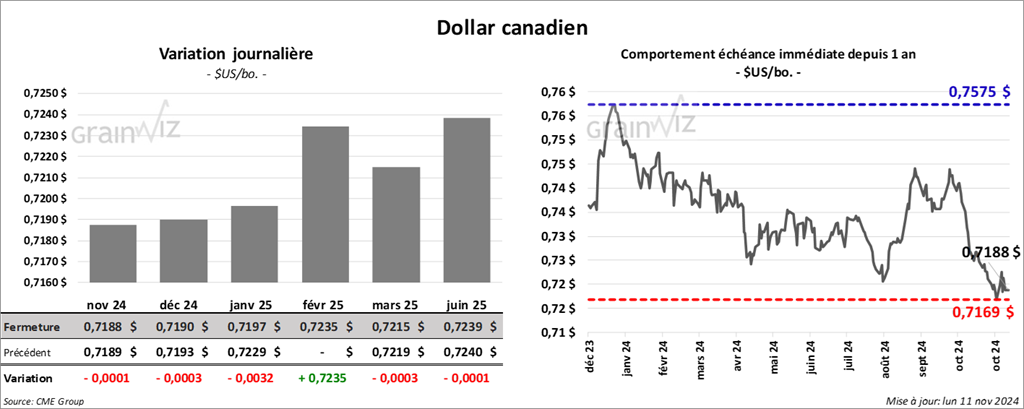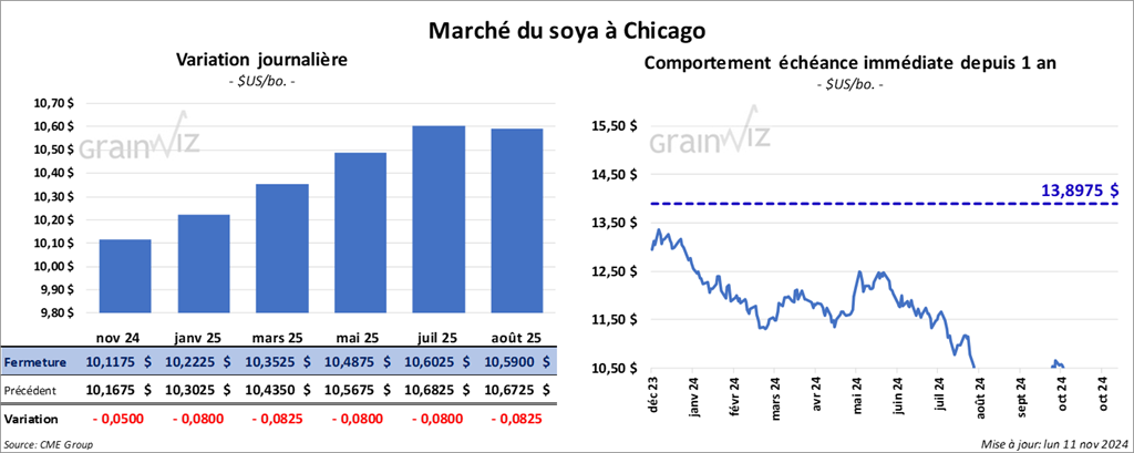 Le contrat de soya US nov. 24 a clôturé à 10,1175 $ (- 5 cents). Celui janv. 25 a fermé à 10,2225 $ (- 8 cents). Celui mars 25 a terminé à 10,3525 $ (- 8 ¼ cents). Quant au tourteau de soya US, le contrat déc. 24 a fini à 295,10 $/tonne (- 1,10 $/tonne). Celui janv. 25 a clôturé à 297,10 $/tonne (- 1,00 $/tonne). Celui mars 25 a fermé à 300,20 $/tonne (- 1,00 $/tonne). Du côté de l’huile de soya US, le contrat déc. 24 a terminé à 48,14 $ (- 63 points). Celui janv. 25 a fini à 48,24 $ (- 61 points).