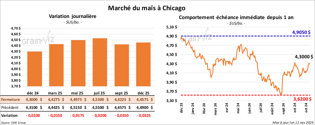 Le contrat de maïs US déc. 24 a clôturé à 4,3000 $ (- 1 cent). Celui mars 25 a fermé à 4,4275 $ (- 1 ½ cent). Celui mai 25 a terminé à 4,4975 $ (- 1 ¾ cent).