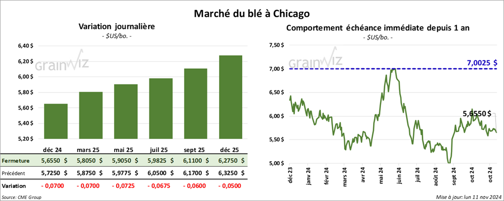 À Chicago, le contrat de blé déc. 24 a clôturé à 5,6550 $ (- 7 cents). Celui mars 25 a fermé à 5,8050 $ (- 7 cents). Celui mai 25 a terminé à 5,9050 $ (- 7 ¼ cents). À Kansas, le contrat de blé rouge d’hiver déc. 24 a fini à 5,6425 $ (- 4 ¾ cents). Celui mars 25 a clôturé à 5,7750 $ (- 4 cents). Celui mai 25 a fermé à 5,8700 $ (- 3 ¾ cents). À Minneapolis, le contrat de blé de printemps déc. 24 a terminé à 5,9200 $ (- 5 ¾ cents). Celui mars 25 a fini à 6,1225 (- 5 cents). Celui mai 25 a clôturé à 6,2375 $ (- 4 ½ cents).