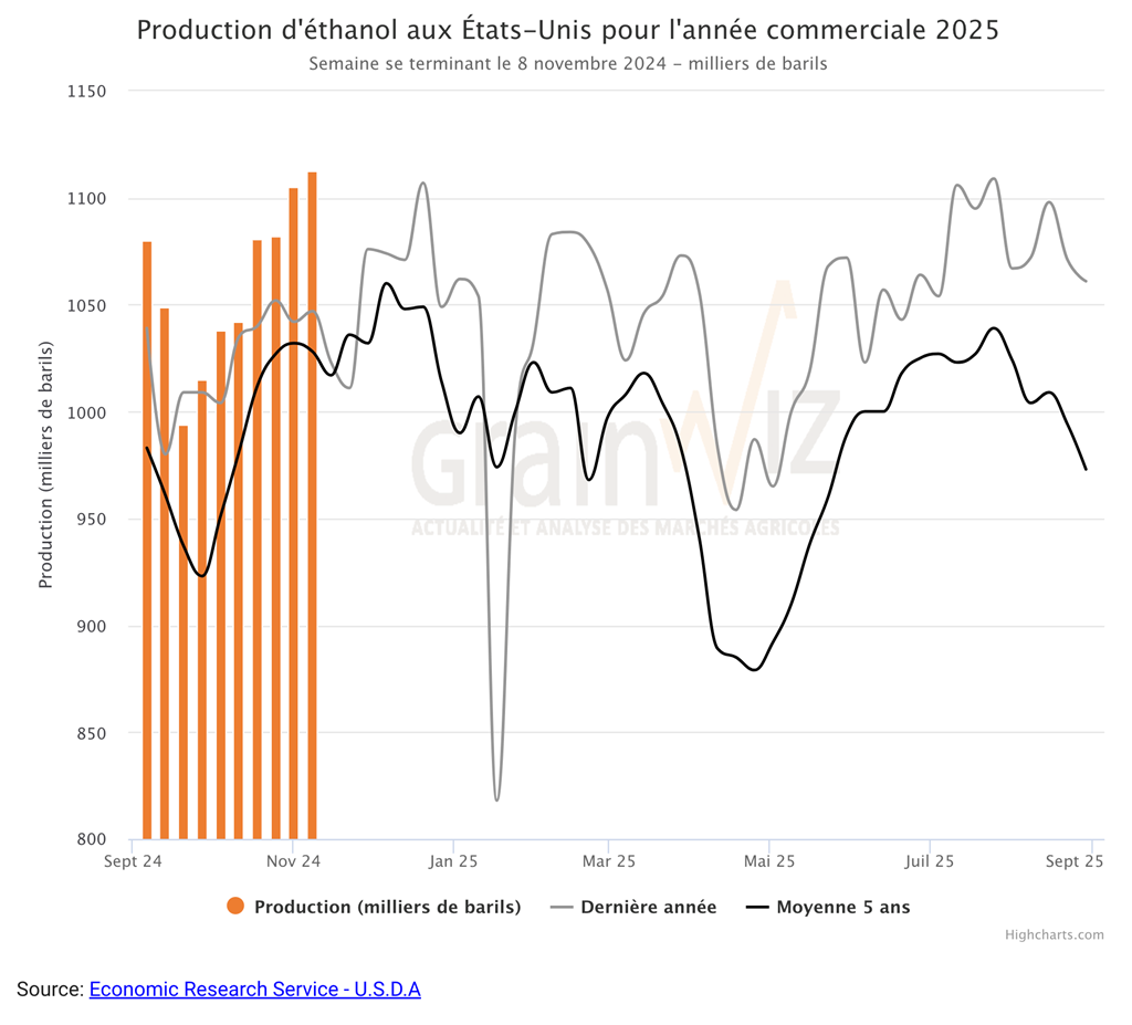 Durant la semaine du 8 novembre dernier, la production moyenne d’éthanol US a été de 1,113 million de barils par jour, ce qui était un record, une augmentation de 0,7 % comparativement à la semaine précédente et une hausse de 6,3 % par rapport à l’an dernier. Un total de 7,791 millions de barils d’éthanol US a été produit au cours de la semaine.112,29 millions de boisseaux de maïs ont été utilisés dans la fabrication de l’éthanol US.
