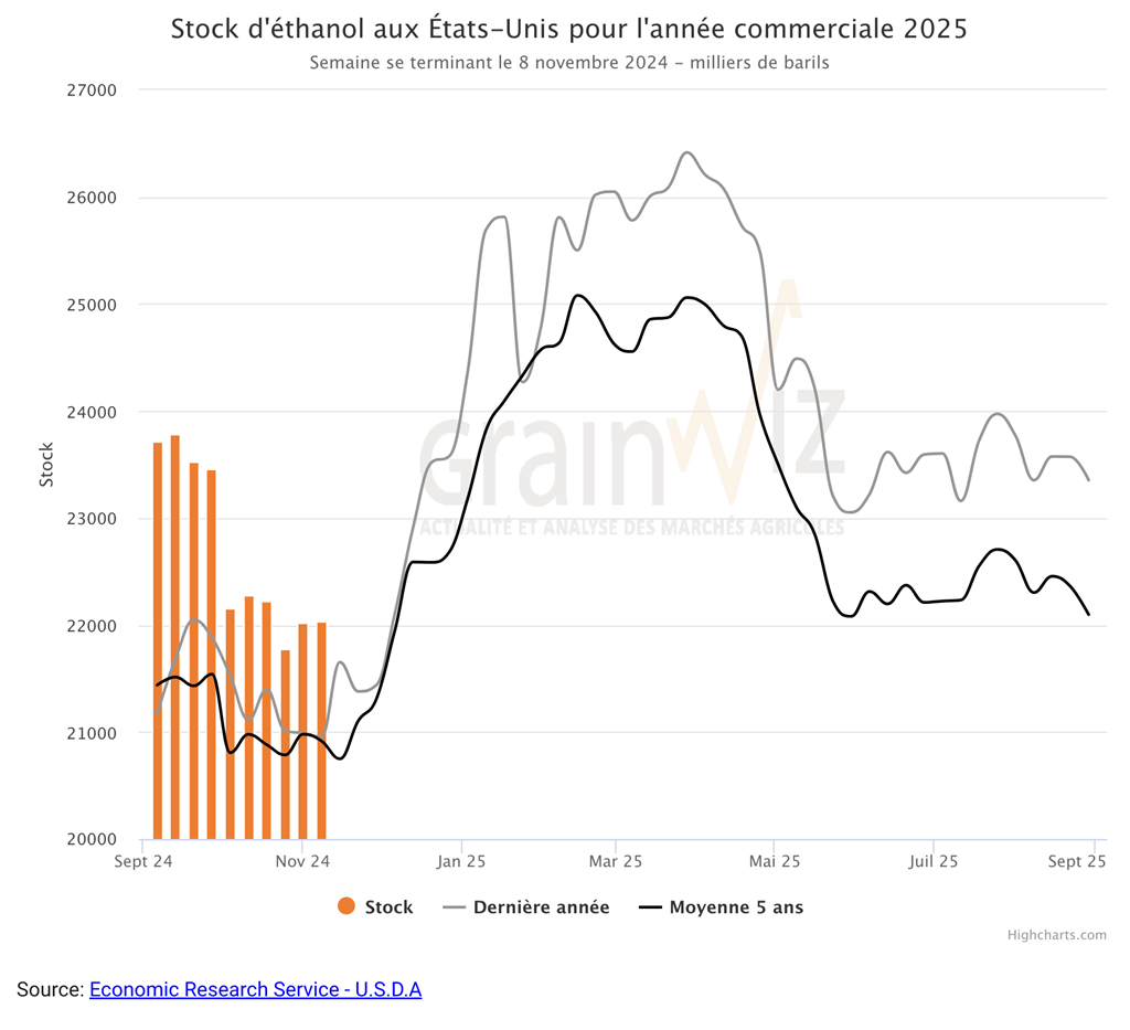 Quant aux inventaires d’éthanol US, ils ont été estimés à 22,039 millions de barils, soit à une augmentation de 0,1 % comparativement à la semaine précédente et à une hausse de 5,2 % par rapport à l’an dernier.