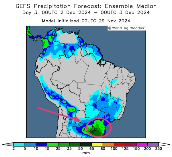 - Cette carte du Brésil, fournie par World Ag Weather et dessinée pour le 3e jour, montre notamment des probabilités de pluies abondantes pour le sud-est, entre Paraná et le Rio Grande do Sul (voir les zones vertes).