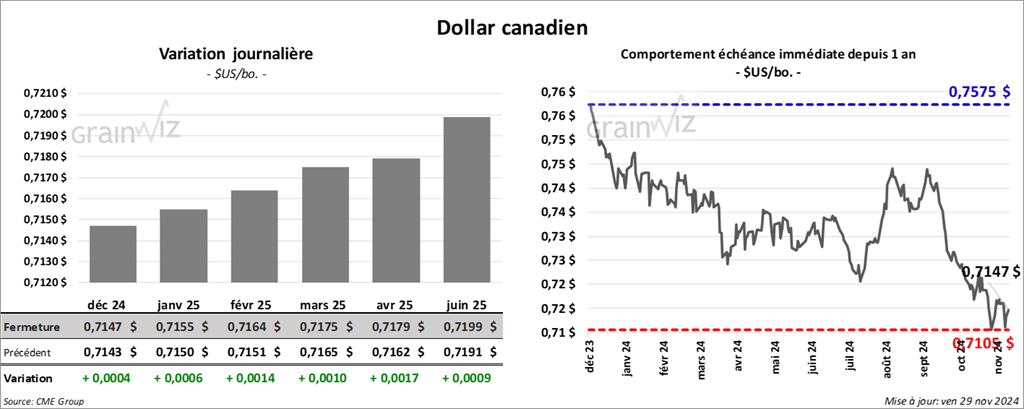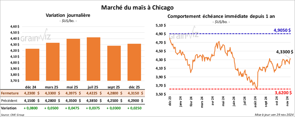 Le contrat de maïs US déc. 24 a clôturé à 4,2300 $ (+ 6 cents). Celui mars 25 a fermé à 4,3300 $ (+ 5 cents). Celui mai 25 a terminé à 4,3975 $ (+ 4 ¾ cents).