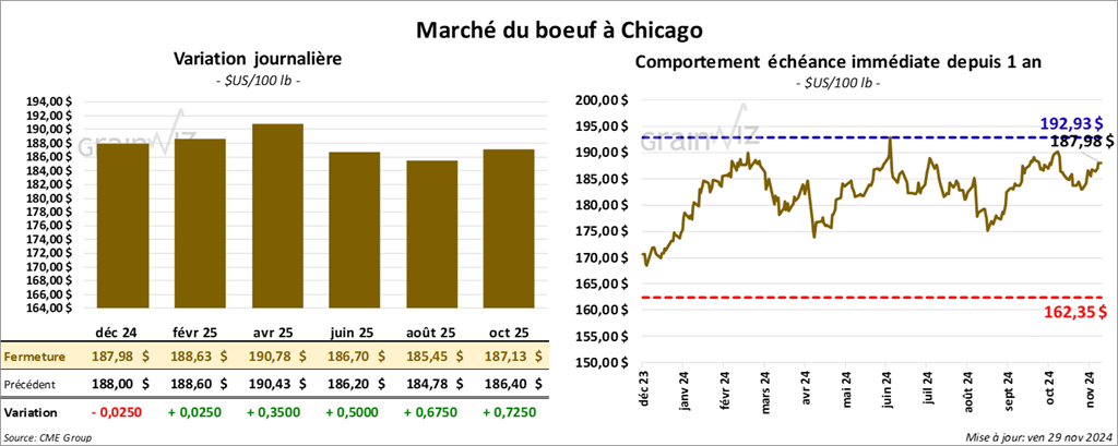 Le contrat de bœuf US déc. 24 a clôturé à 187,98 $ (- 2 ½ cents). Celui févr. 25 a fermé à 188,63 $ (+ 2 ½ cents). Celui avr. 25 a terminé à 190,78 $ (+ 35 cents). Quant au veau US, le contrat janv. 25 a fini à 259,48 $ (+ 70 cents). Celui mars 25 a clôturé à 258,63 $ (+ 1,32 $). Celui avr. 25 a fermé à 259,63 $ (+ 1,23 $).