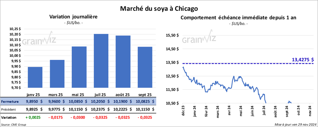 - La journée dans le soya US et ses dérivés a été marquée par des ventes probablement motivées par la fin de la semaine, une occasion de fermetures de positions avant le week-end. Il faut dire que la session était écourtée en raison de la Thanksgiving.