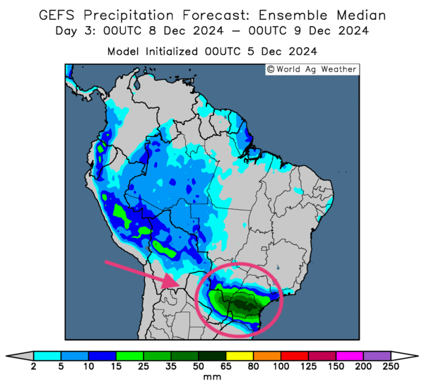 - Globalement, les conditions météo en Argentine sont correctes, à court terme du moins. L’analyse des cartes de l’Argentine, fournies par World Ag Weather et dessinées jusqu’au 3e jour, révèle des possibilités de pluie pour le nord, le nord-est et certaines parties plus au sud.