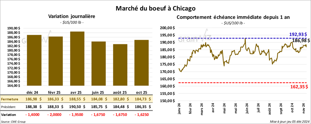 Le contrat de bœuf US déc. 24 a clôturé à 186,98 $ (- 1,40 $). Celui févr. 25 a fermé à 186,33 $ (- 2,00 $). Celui avr. 25 a terminé à 188,55 $ (- 1,95 $). Quant au veau US, le contrat janv. 25 a fini à 254,93 $ (- 2,03 $). Celui mars 25 a clôturé à 253,60 $ (- 2,10 $). Celui avr. 25 a fermé à 254,63 $ (- 2,08 $).