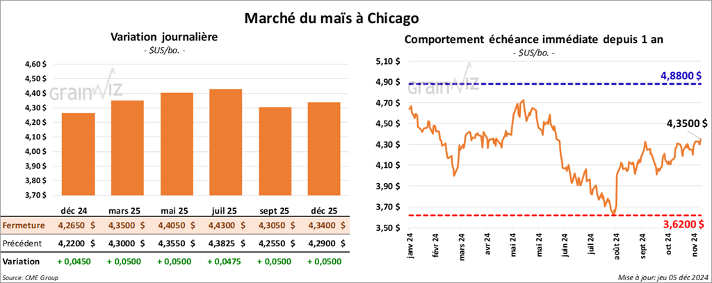 Le contrat de maïs US déc. 24 a clôturé à 4,2650 $ (+ 4 ½ cents). Celui mars 25 a fermé à 4,3500 $ (+ 5 cents). Celui mai 25 a terminé à 4,4050 $ (+ 5 cents).