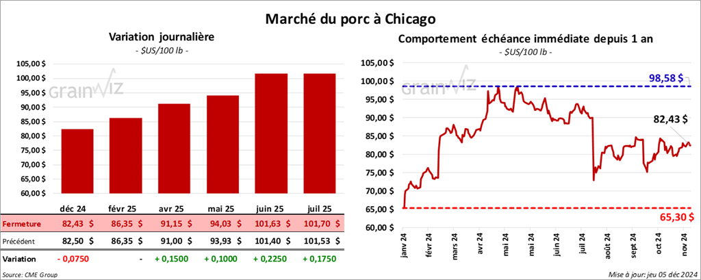 Le contrat de porc US déc. 24 a clôturé à 82,43 $ (- 8 cents). Celui févr. 25 a fermé à 86,35 $ (0,0). Celui avr. 25 a terminé à 91,15 $ (+ 15 cents).