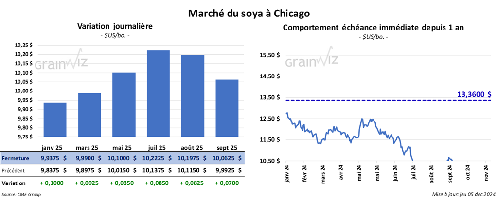 Le contrat de soya US janv. 25 a clôturé à 9,9375 $ (+ 10 cents). Celui mars 25 a fermé à 9,9900 $ (+ 9 ¼ cents). Celui mai 25 a terminé à 10,1000 $ (+ 8 ½ cents). Quant au tourteau de soya US, le contrat déc. 24 a fini à 287,40 $/tonne (- 60 cents/tonne). Celui janv. 25 a clôturé à 291,10 $/tonne (- 80 cents/tonne). Celui mars 25 a fermé à 296,50 $/tonne (- 50 cents/tonne). Du côté de l’huile de soya US, le contrat déc. 24 a terminé à 42,12 $ (+ 89 points). Celui janv. 25 a fini à 42,31 $ (+ 89 points).