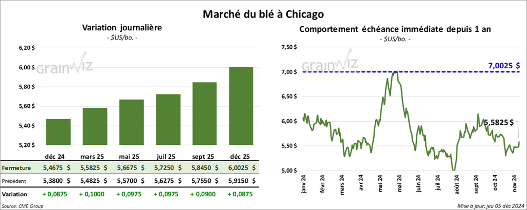 À Chicago, le contrat de blé déc. 24 a clôturé à 5,4675 $ (+ 8 ¾ cents). Celui mars 25 a fermé à 5,5825 $ (+ 10 cents). Celui mai 25 a terminé à 5,6675 $ (+ 9 ¾ cents). À Kansas, le contrat de blé dur rouge d’hiver déc. 24 a fini à 5,2775 (+ 3 cents). Celui mars 25 a clôturé à 5,4250 % (+ ¾ cent). Celui mai 25 a fermé à 5,5000 $ (- ½ cent). À Minneapolis, le contrat de blé de printemps déc. 24 a terminé à 5,6850 $ (0,0). Celui mars 25 a fini à 5,9850 $ (+ 9 cents). Celui mai 25 a clôturé à 6,0550 $ (+ 8 ½ cents).