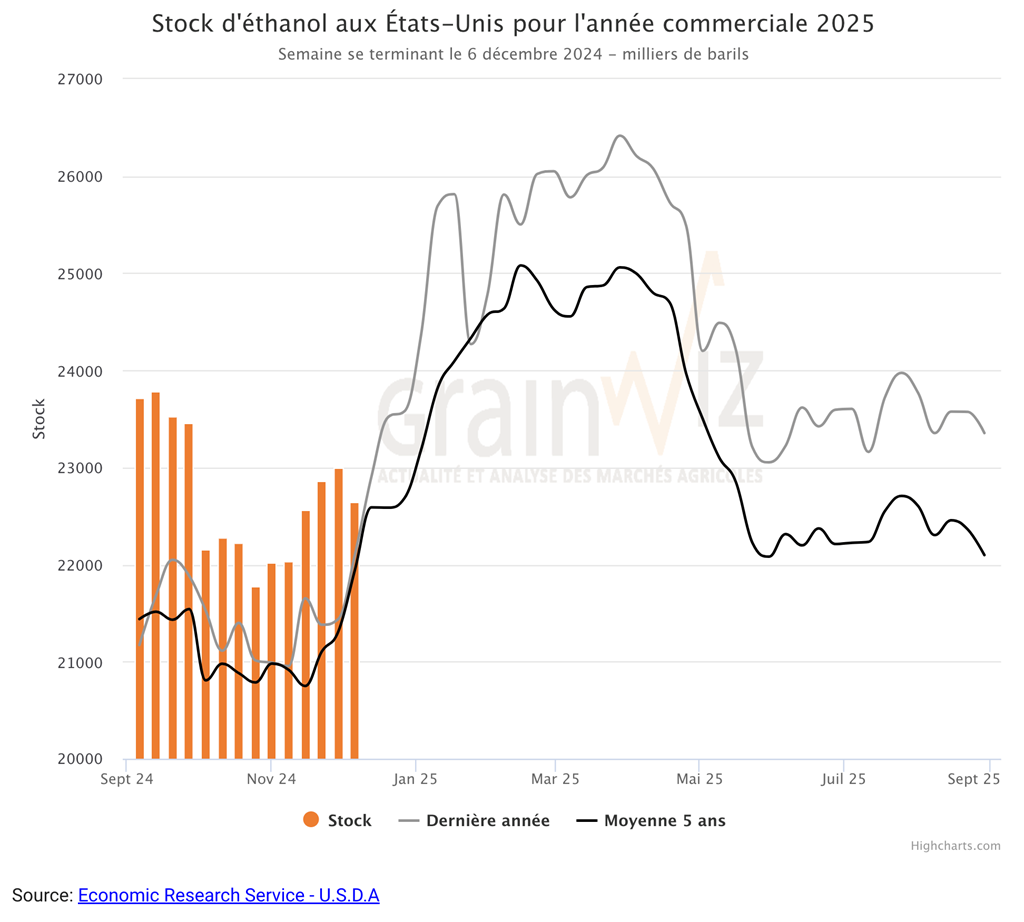 Durant la semaine du 6 décembre dernier, la production moyenne d’éthanol US a été de 1,078 million de barils par jour, une hausse de 0,5 % comparativement à la semaine précédente et une augmentation de 0,4% par rapport à l’an passé. Les analystes ne s’attendaient pas à des changements. Au total, 7,546 millions de barils ont été produits au cours de la semaine. 108,76 millions de boisseaux de maïs ont été utilisés dans la fabrication de l’’éthanol US.