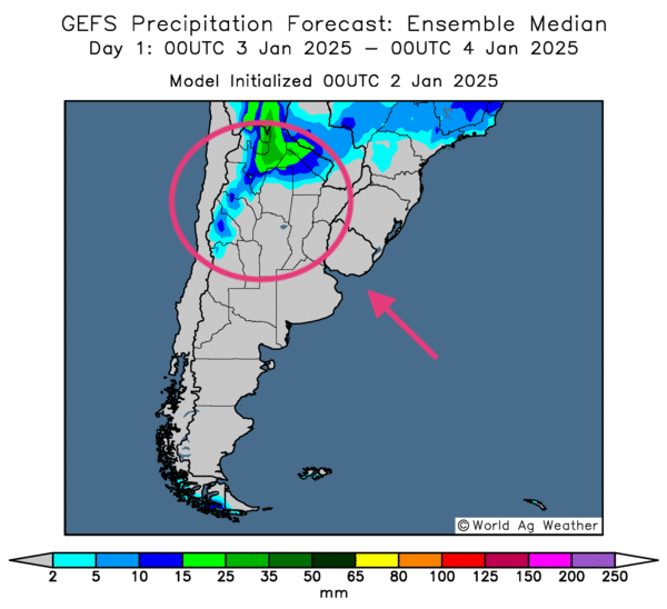 - Comme le montre cette carte de l’Argentine (modèle GFS), fournie par World Ag Weather et dessinée pour demain, il y a des possibilités d’averses bénéfiques pour le nord-ouest et l’ouest. Le reste de l’Argentine pourrait connaître un temps toujours plus sec.