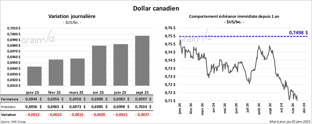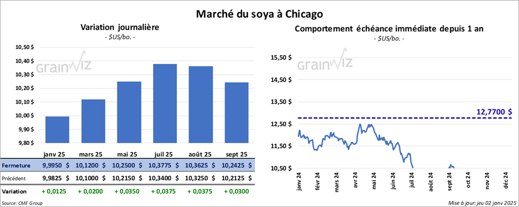 Le contrat de soya US janv. 25 a clôturé à 9,9950 $ (+ 1 ¼ cent). Celui mars 25 a fermé à 10,1200 $ (+ 2 cents). Celui mai 25 a terminé à 10,2500 $ (+ 3 ½ cents). Quant au tourteau de soya US, le contrat janv. 25 a fini à 319,90 $/tonne (+ 2,60 $/tonne). Celui mars 25 a clôturé à 319,90 $/tonne (+ 2,60 $/tonne). Celui mai 25 a fermé à 326,50 $/tonne (+ 3,60 $/tonne). Du côté de l’huile de soya US, le contrat janv. 25 a terminé à 39,72 $ (- 6 points). Celui mars 25 a fini à 40,27 $ (- 9 points).