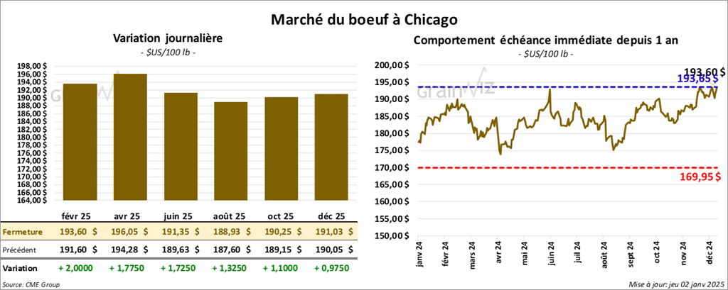 Le contrat de bœuf US févr. 25 a clôturé à 193,60 $ (+ 2,00 $). Celui avr. 25 s fermé à 196,05 $ (+ 1,78 $). Celui juin 25 a terminé à 191,35 $ (+ 1,73 $). Quant au veau US, le contrat janv. 25 a fini à 266,48 $ (+ 3,45 $). Celui mars 25 a clôturé à 266,20 $ (+ 3,23 $). Celui avr. 25 a fermé à 266,52 $ (+ 2,98 $).