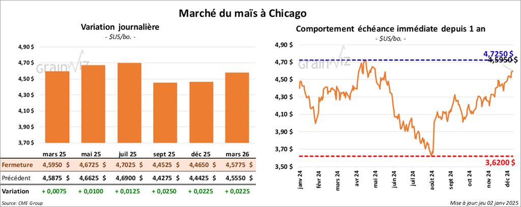 Le contrat de maïs mars 25 a clôturé à 4,5950 $ (+ ¾ cent). Celui mai 25 a fermé à 4,6725 $ (+ 1 cent). Celui juil. 25 a terminé à 4,7025 $ (+ 1 ¼ cent).