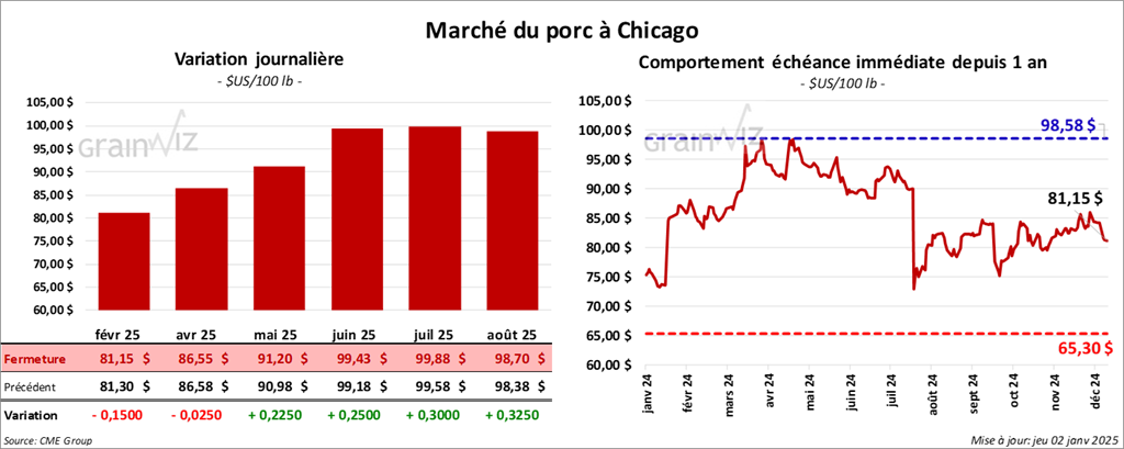 Le contrat de porc US févr. 25 a clôturé à 81,15 $ (- 15 cents). Celui avr. 25 a fermé à 86,55 $ (- 3 cents). Celui mai 25 a terminé à 91,20 $ (+ 23 cents).