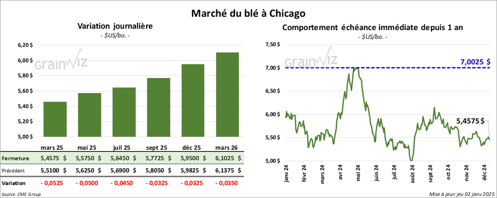 À Chicago, le contrat de blé mars 25 a clôturé à 5,4575 $ (- 5 ¼ cents). Celui mai 25 a fermé à 5,5750 $ (- 5 cents). Celui juil. 25 a terminé à 5,6450 $ (- 4 ½ cents). À Kansas, le contrat de blé dur rouge d’hiver mars 25 a fini à 5,5925 $ (+ 3 ½ cents). Celui mai 25 a clôturé à 5,6775 $ (+ 3 ¼ cents). Celui juil. 25 a fermé à 5,7600 $ (+ 3 cents). À Minneapolis, le contrat mars 25 a terminé à 5,8950 $ (- 6 ¼ cents). Celui mai 25 a fini à 5,9800 $ (- 5 ½ cents). Celui juil. 25 a clôturé à 6,0600 $ (- 5 cents).