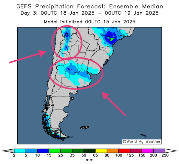 - Globalement, les conditions météo de l’Argentine sont toujours à surveiller à court terme. L’analyse des cartes de l’Argentine (modèle GFS), fournies par World Ag Weather et dessinées jusqu’au 3e jour, révèle des possibilités de pluies intéressantes seulement à partir du 18 janvier (samedi). Mais ces précipitations, qui toucheront surtout le centre et l’est de l’Argentine, risquent d’être légères et insuffisantes pour contrer les effets de la chaleur et de la sécheresse qui exercent des pressions depuis un bon moment.