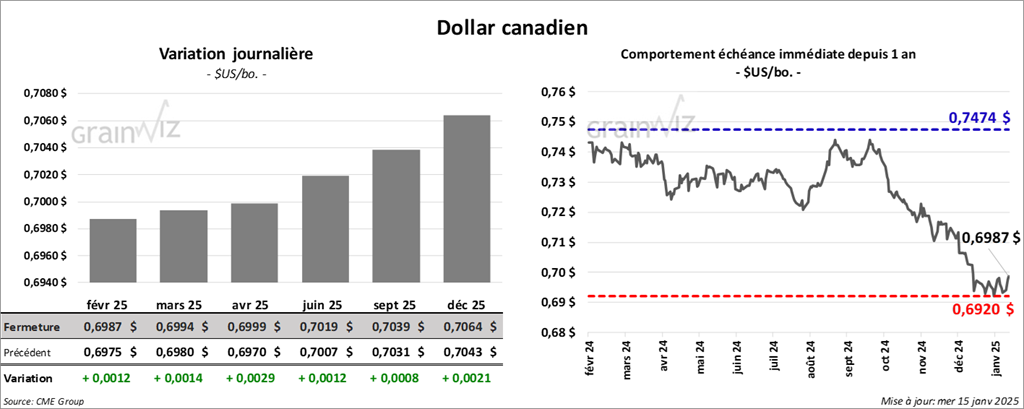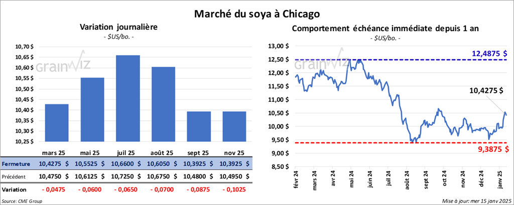 Le contrat de soya US mars 25 a clôturé à 10,4275 $ (- 4 ¾ cents). Celui mai 25 a fermé à 10,5525 $ (- 6 cents). Celui juil. 25 a terminé à 10,6600 $ (- 6 ½ cents). Quant au tourteau de soya US, le contrat mars 25 a fini à 302,00 $/tonne (- 3,80 $/tonne). Celui mai 25 a clôturé à 309,10 $/tonne (- 3,80 $/tonne). Celui juil. 25 a fermé à 315,20 $/tonne (- 3,90 $/tonne). Du côté de l’huile de soya US, le contrat mars 25 a terminé à 46,27 $ (+ 5 points). Celui mai 25 a fini à 46,67 $ (+ 3 points).
