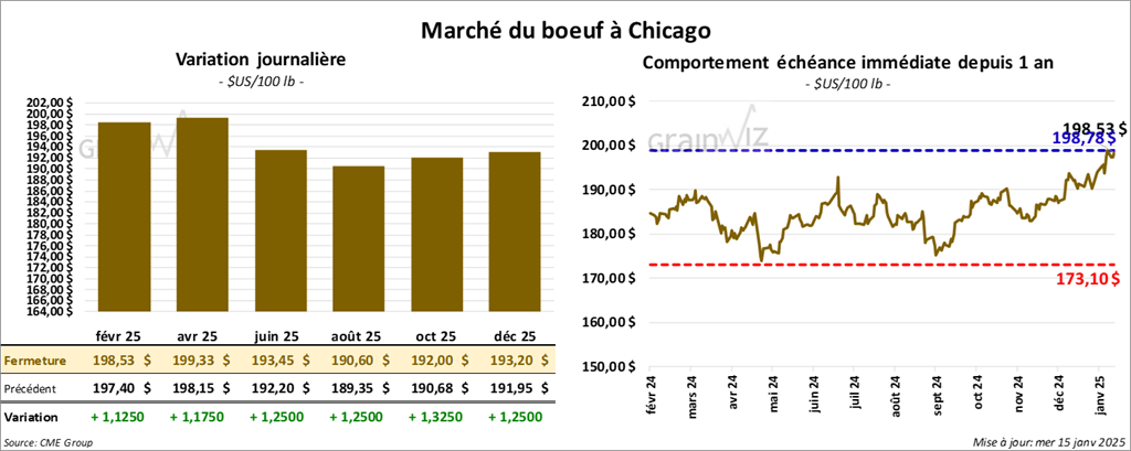 Le contrat de bœuf US avr. 25 a clôturé à 198,53 $ (+ 1,13 $). Celui avr. 25 a fermé à 199,33 $ (+ 1,18 $). Celui juin 25 a terminé à 193,45 $ (+ 1,25 $). Quant au veau US, le contrat janv. 25 a fini à 275,23 $ (+ 1,13 $). Celui mars 25 a clôturé à 269,80 $ (+ 1,60 $). Celui avr. 25 a fermé 270,13 $ (+ 1,57 $).