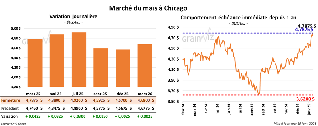 Le contrat de maïs US mars 25 a clôturé à 4,7875 $ (+ 4 ¼ cents). Celui mai 25 a fermé à 4,8900 $ (+ 3 ¼ cents). Celui juil. 25 a terminé à 4,9200 $ (+ 3 cents).