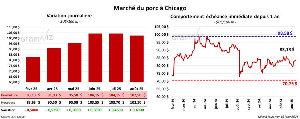 Le contrat de porc US févr. 25 a clôturé à 83,13 $ (- 50 cents). Celui avr. 25 a fermé 91,03 $ (+ 53 cents). Celui mai 25 a terminé à 95,58 $ (+ 50 cents).