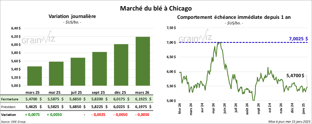 À Chicago, le contrat de blé mars 25 a clôturé à 5,4700 $ (+ ¾ cents). Celui mai 25 a fermé à 5,5875 $ (+ ½ cent). Celui juil. 25 a terminé à 5,6850 $ (0,0). À Kansas, le contrat de blé dur rouge d’hiver mars 25 a fini à 5,6075 $ (- ¼ cent). Celui mai 25 a clôturé à 5,7025 $ (- ¼ cent). Celui juil. 25 a fermé à 5,7950 $ (0,0). À Minneapolis, le contrat mars 25 a terminé à 5,8750 $ (- 2 cents). Celui mai 25 a fini à 5,9800 $ (- ¼ cent). Celui juil. 25 a clôturé à 6,0925 $ (+ 1 ½ cent).