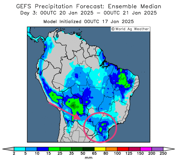 - Cette carte du Brésil (modèle GFS), fournie par World Ag Weather et dessinée pour le 3e jour, indique notamment des possibilités de pluies dans les secteurs asséchés du Sud-Est (voir la zone encerclée).