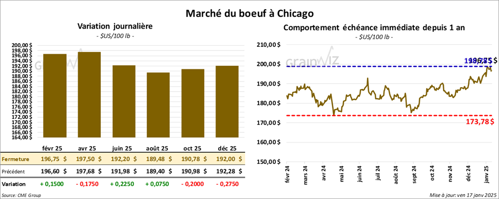 Le contrat de bœuf US févr. 25 a clôturé à 196,75 $ (+ 15 cents). Celui avr. 25 a fermé à 197,50 $ (- 18 cents). Celui juin 25 a terminé à 192,20 $ (+ 23 cents). Quant au veau US, le contrat janv. 25 a fini à 273,50 $ (+ 5 cents). Celui mars 25 a clôturé à 268,05 $ (+ 33 cents). Celui avr. 25 a fermé à 268,13 $ (- 7 cents).