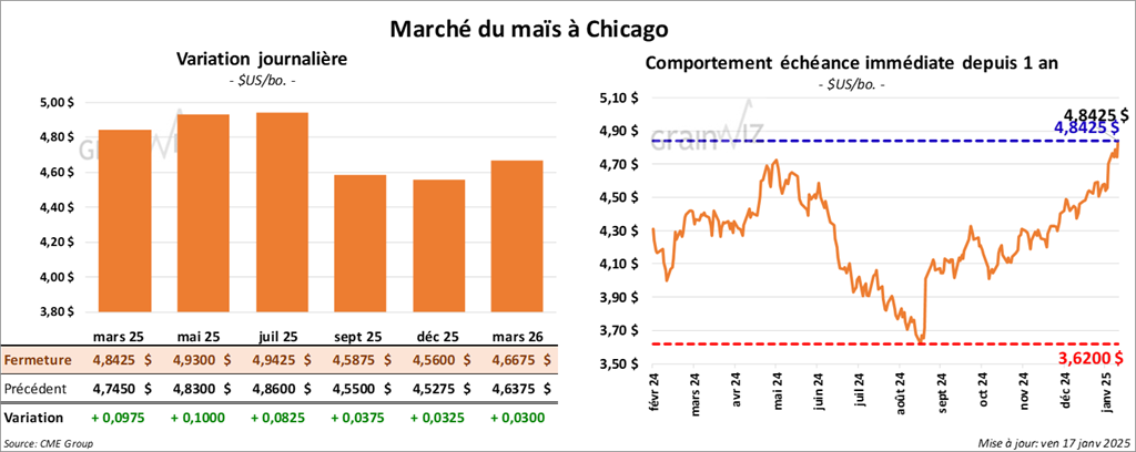 Le contrat de maïs US mars 25 a clôturé à 4,8425 $ (+ 9 ¾ cents). Le contrat mai 25 a fermé à 4,9300 $ (+ 10 cents). Celui juil. 25 a terminé à 4,9425 $ (+ 8 ¼ cents).