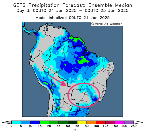 - Cette carte du Brésil (modèle GFS), fournie par World Ag Weather et dessinée pour le 3e jour, révèle des possibilités de pluie pour le centre et certaines parties du Sud-Est. Des régions comme le Mato Grosso do Sul et le Sao Paulo pourraient être exemptes de précipitations (voir les zones encerclées).