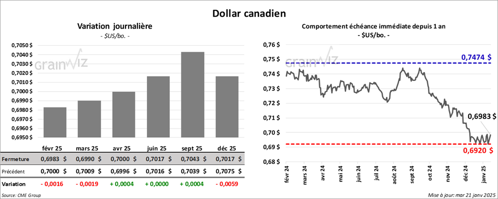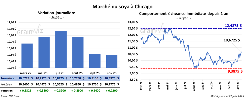 Le contrat de soya US mars 25 a clôturé à 10,6725 $ (+ 33 ¼ cents). Celui mai 25 a fermé à 10,7775 $ (+ 33 cents). Celui juil. 25 a terminé à 10,8725 $ (+ 32 cents). Quant au tourteau de soya US, le contrat mars 25 a fini à 311,00 $/tonne (+ 13,80 $/tonne). Celui mai 25 a clôturé à 318,60 $/tonne (+ 13,60 $/tonne). Celui juil. 25 a fermé à 325,00 $/tonne (+ 13,40 $/tonne). De côté de l’huile de soya US, le contrat mars 25 a terminé à 45,77 $ (+ 8 points). Celui mai 25 a fini à 46,16 $ (+ 4 points).
