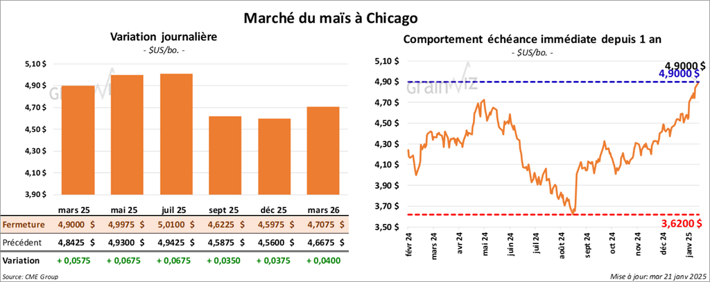 Le contrat de maïs US mars 25 a clôturé à 4,9000 $ (+ 5 ¾ cents). Celui mai 25 a fermé à 4,9975 $ (+ 6 ¾ cents). Celui juil. 25 a terminé à 5,0100 $ (+ 6 ¾ cents).