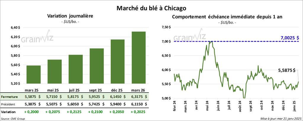 À Chicago, le contrat mars 25 a clôturé à 5,5875 $ (+ 20 cents). Celui mai 25 a fermé à 5,7150 $ (+ 20 ¾ cents). Celui juil. 25 a terminé à 5,8175 $ (+ 21 ¼ cents). À Kansas, le contrat de blé dur rouge d’hiver mars 25 a fini à 5,4850 $ (+ ¼ cent). Celui mai 25 a clôturé à 5,5850 $ (0,0). Celui juil. 25 a fermé à 5,6725 $ (- ¼ cent). À Minneapolis, le contrat de blé de printemps mars 25 a terminé à 6,0450 $ (+ 21 cents). Celui mai 25 a fini à 6,1500 $ (+ 21 ¾ cents). Celui juil. 25 a clôturé à 6,2575 $ (+ 22 ¼ cents).