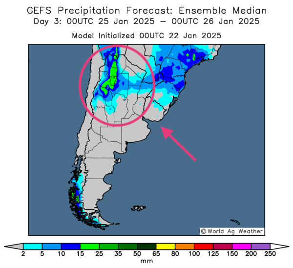 - Cette carte de l’Argentine (modèle GFS), fournie par World Ag Weather et dessinée pour le 3e jour, indique des possibilités de précipitations pour le Nord et le Nord-Ouest (voir la zone encerclée).