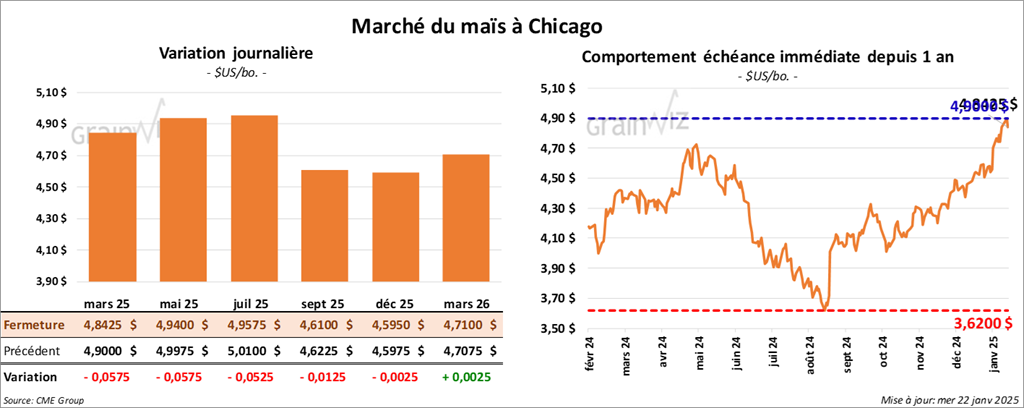 Le contrat de maïs US mars 25 a clôturé à 4,8425 $ (- 5 ¾ cents). Celui mai 25 a fermé à 4,9400 $ (- 5 ¾ cents). Celui juil. 25 a terminé à 4,9575 $ (- 5 ¼ cents).
