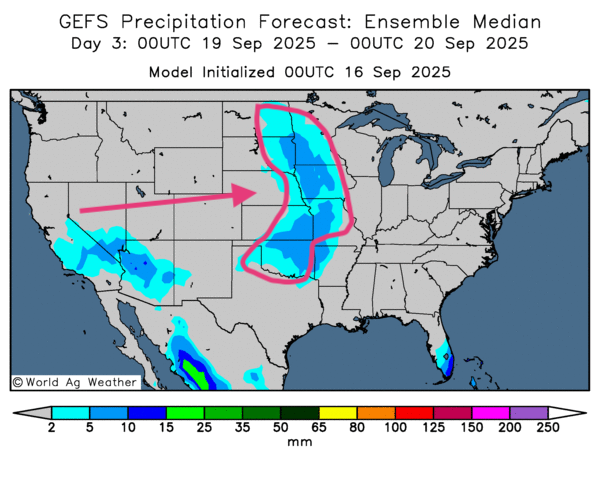 - Bilan: prévisions globalement favorables, mais à surveiller; les cartes GFS de World Ag Weather (illustrées jusqu’au 3e jour) montrent des pluies possibles sur les Plaines et l’ouest du Midwest (voir carte), alors que l’est du Corn Belt resterait plus sec.