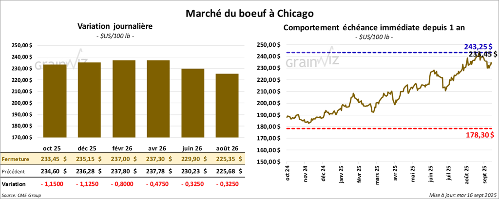 Le contrat de bœuf américain octobre 25 a clôturé à 233,45 $ (- 1,15 $). Celui décembre 25 a fermé à 235,15 $ (-1,13 $). Celui février 26 a terminé à 237,00 $ (- 80 cents).