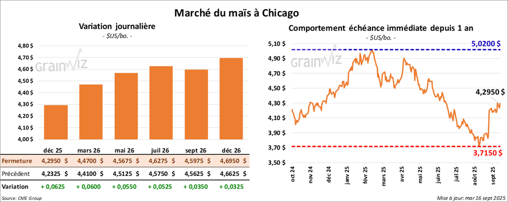 Le contrat de maïs américain décembre 25 a clôturé à 4,2950 $ (+ 6 ¼ cents). Celui mars 26 a fermé à 4,4700 $ (+ 6 cents). Celui mai 26 a terminé à 4,5675$ (+ 5 ½ cents).